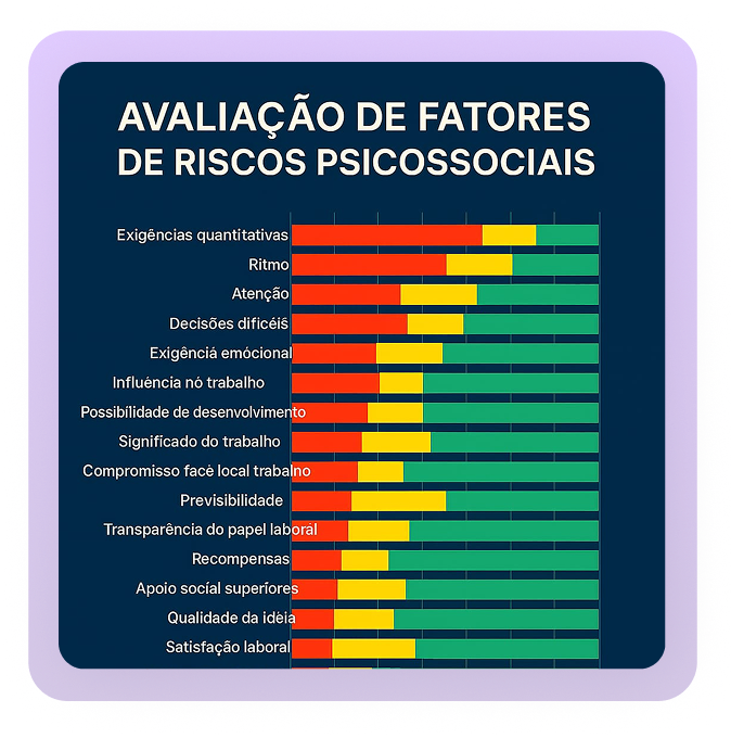 Já os riscos psicossociais surgem quando esses fatores estão presentes de forma desequilibrada, intensa ou prolongada, gerando impactos negativos à saúde dos trabalhadores. Por exemplo: